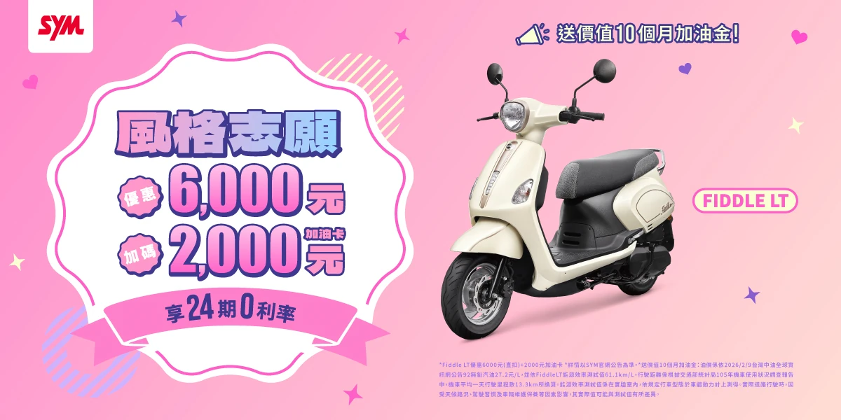 - 三陽購車加碼優惠2,000元(加油卡)